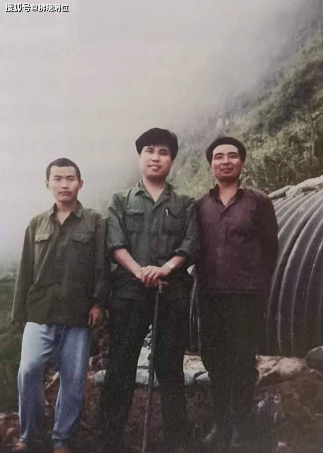 1986年4月28日,采访4·26战斗后作者与连长杨明岐、政指高云鹏在阵地上合影。